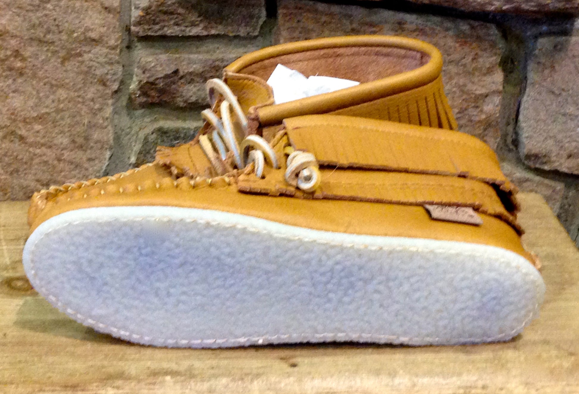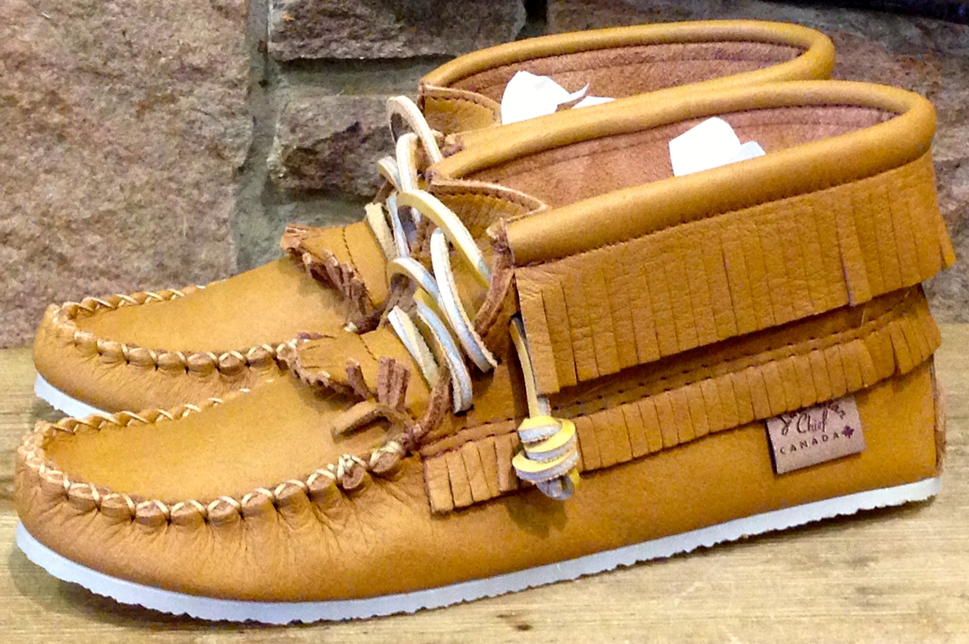 Made from beautiful soft but still thick, and therefore durable, Moose Hide. Fringes across the top of foot and around the ankle.