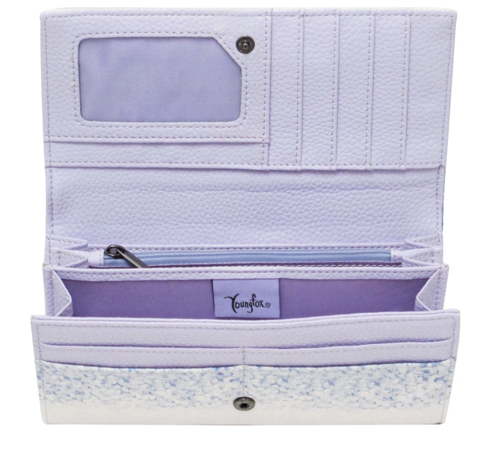 Wallets are made from synthetic leather measuring 19x10x3 cm. The wallet has 14 card slots, 6 pockets, and a zipped change pocket.
