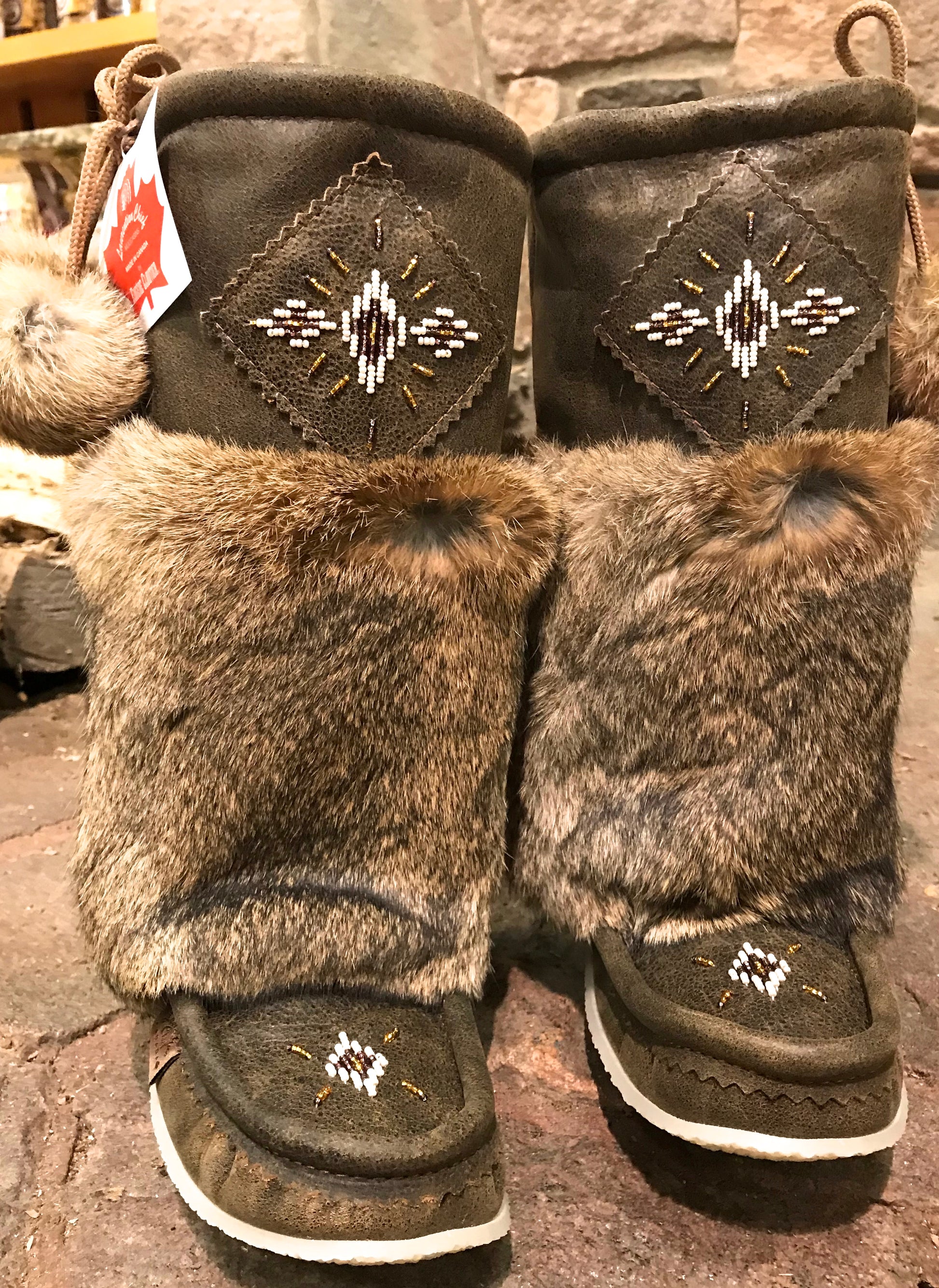 New Brown Leather Mukluks are the ultimate in Winter footwear. Mukluks come with a thick rubber sole that is designed to be worn outside or lounging around the cabin. Cozy Fleece lining along leg shaft and footbed. Brown Rabbit fur trim up the leg and pom-poms, hand-beading complete the look.